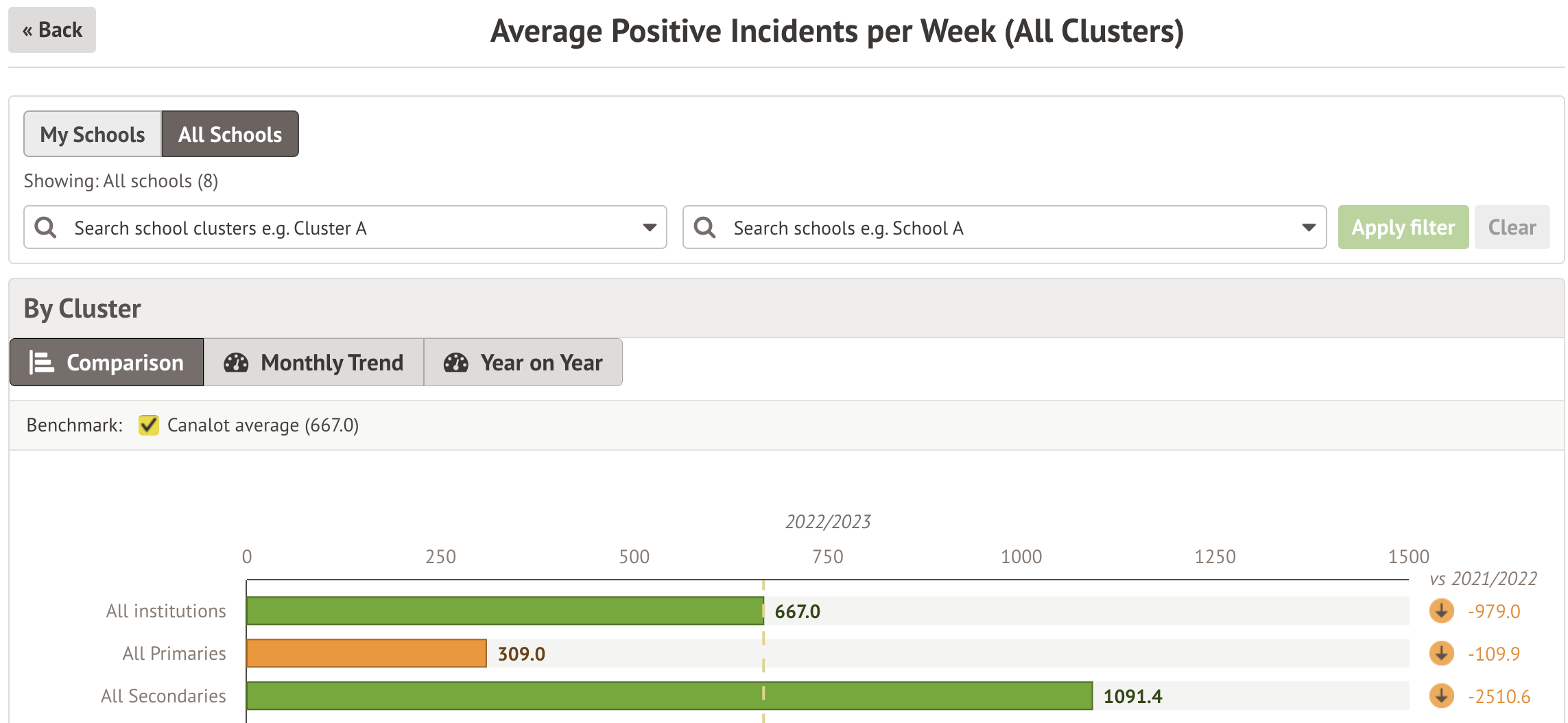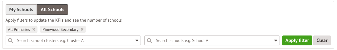 To look at specific schools or clusters, add them to the filter, then click Apply filter.