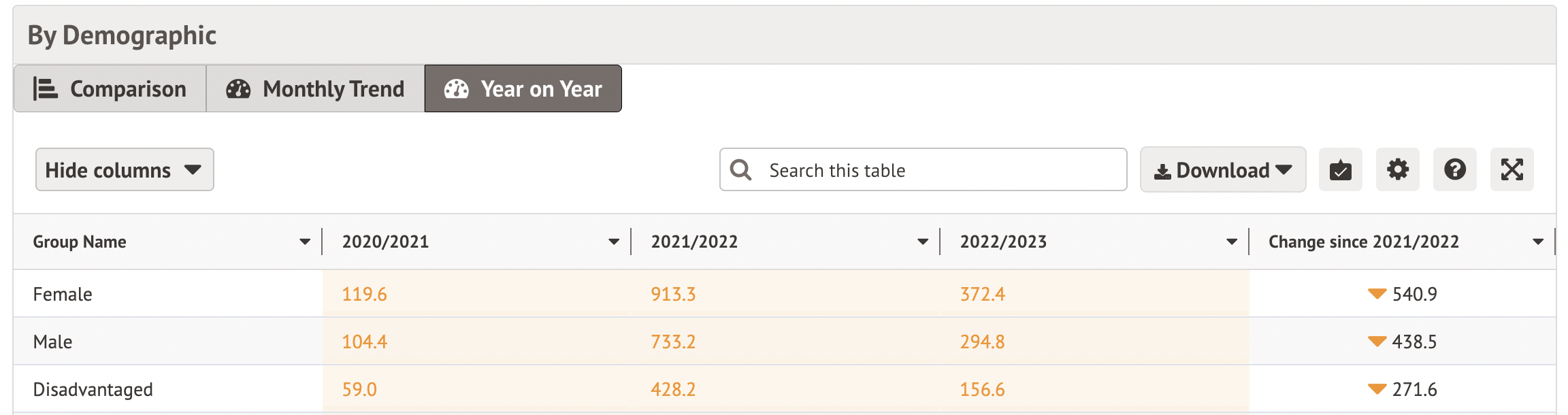Click into a measure to drill down. Display your data by chart, a table of year on year trends or a list of students. Use the drop-down menu to group your data by Cluster, Demographic, Ethnicity or Year Group.