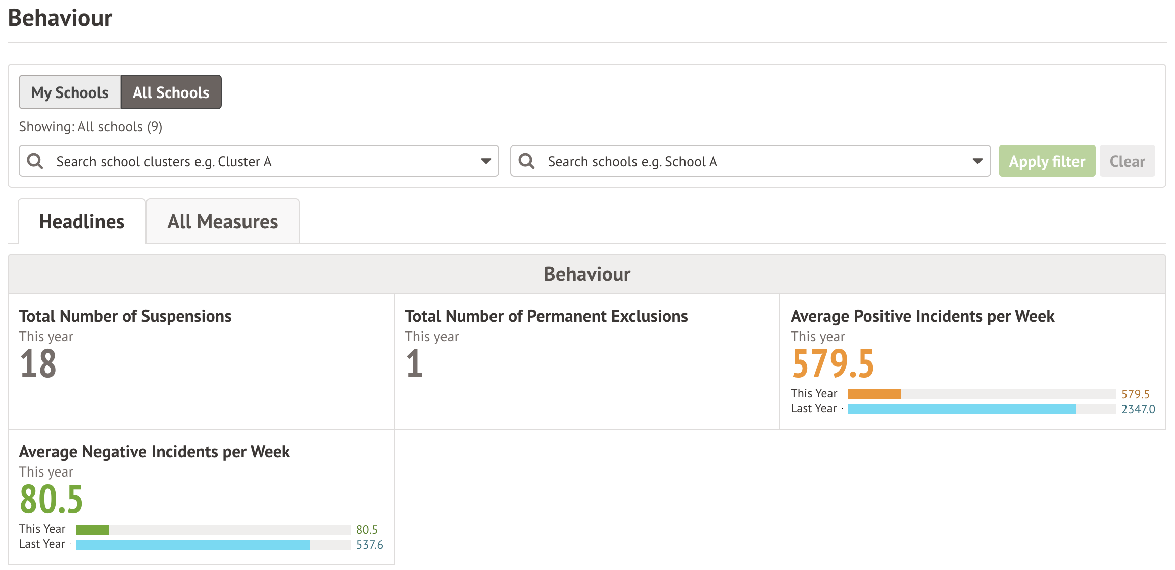 Drill down into your behaviour data for suspensions, permanent exclusions and positive and negative incidents all the way from MAT-wide averages, through your data split by school or demographic, all the way down to individual pupils.