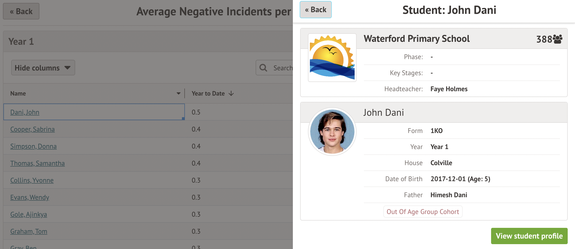 Identify which students are affecting your averages and view their behaviour, then jump directly to their student profile on the School site (you'll need to have permission to log into a school site).