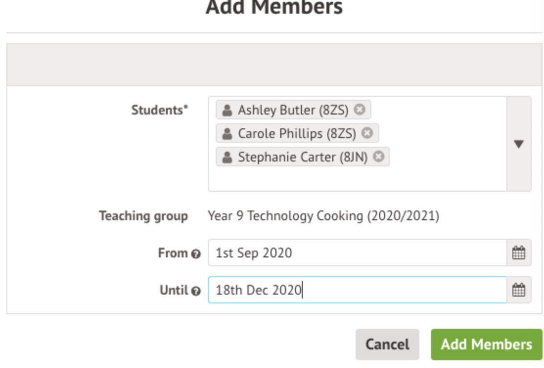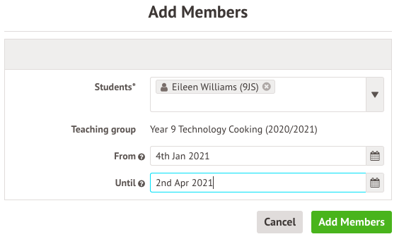 Next, you'll need to add which students will be doing each subject at which time. Click into the teaching group and click to add new members. Select all the students that will be in the first rotation and add in the dates they will be taking this subject. You'll need to repeat this for each group of students, adding in the different relevant dates.