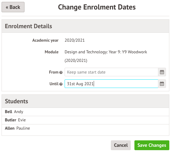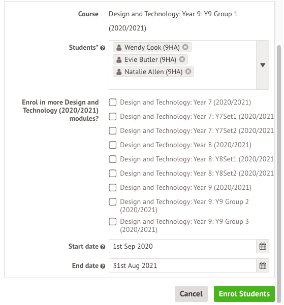 If you picked option 1 or 3, you'll need to click into the course from School > Programmes > Courses, select the students and amend their enrolment dates for each subject.
