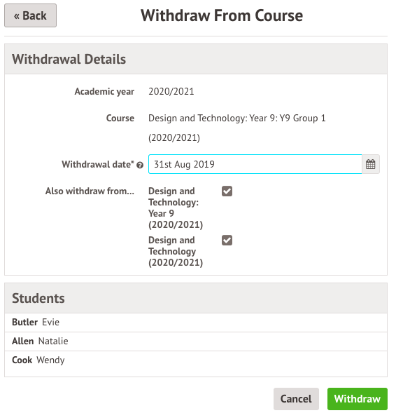 The method of fixing this will depend on how you set up your carouseling course. If you picked option 1, 3 or 4, you'll need to click into the course from School > Programmes > Courses, select the students and select Withdraw students.