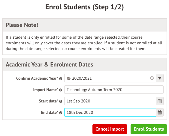 When you import your spreadsheet, edit the date range so that the enrolment ends at the end of the first rotation. You'll need to repeat this process for however many rotations will happen in a year. In my example I have 3 terms, so I'll need to complete the process three times.