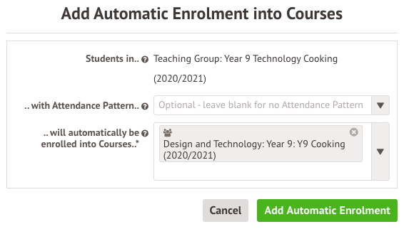 Then add an automatic enrolment so the students are automatically enrolled in the class and added to the register when they have an active enrolment in the teaching group.