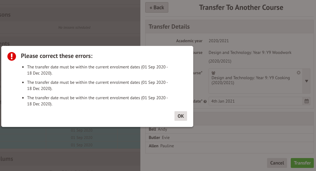 You'll get an error if you are trying to transfer students to a different class outside of the enrolment dates into their current class. This usually happens when you set the original end dates as the end of the rotation, rather than the end of the academic year.