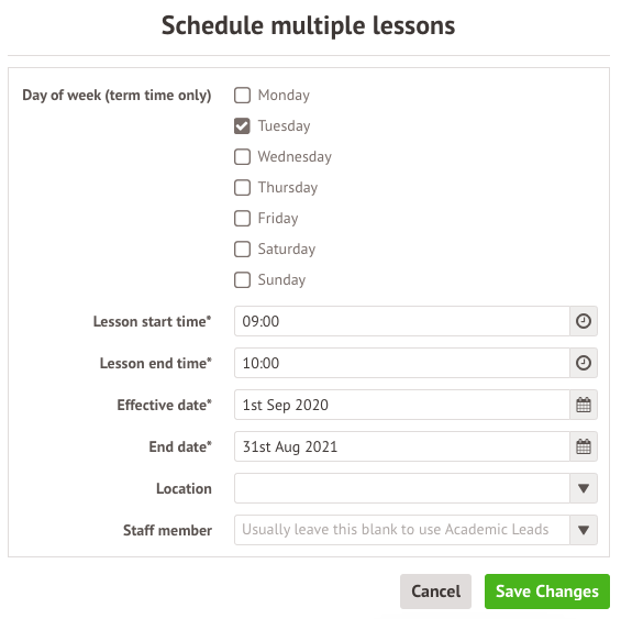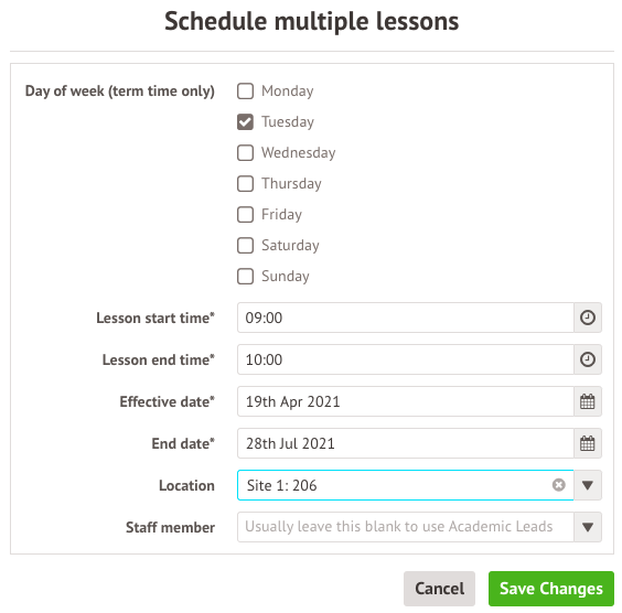 You'll then end up with lessons scheduled at the same time during the day, but with different effective dates, rooms and staff members.
