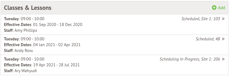 To schedule lessons for this class, click +Add in the Classes & Lessons section. You can then choose to schedule multiple regular lessons.