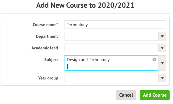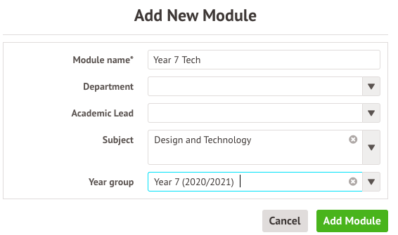 In the slide over add the name of the module e.g. Year 7 Tech and fill in the other details. This time select the year group. Then click the green Add Module button.