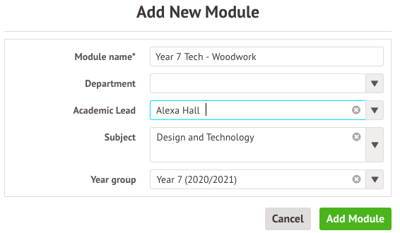 In the slide over add the name of the module e.g. Year 7 Tech - Woodwork, and fill in the other details. Then click the green Add Module button.