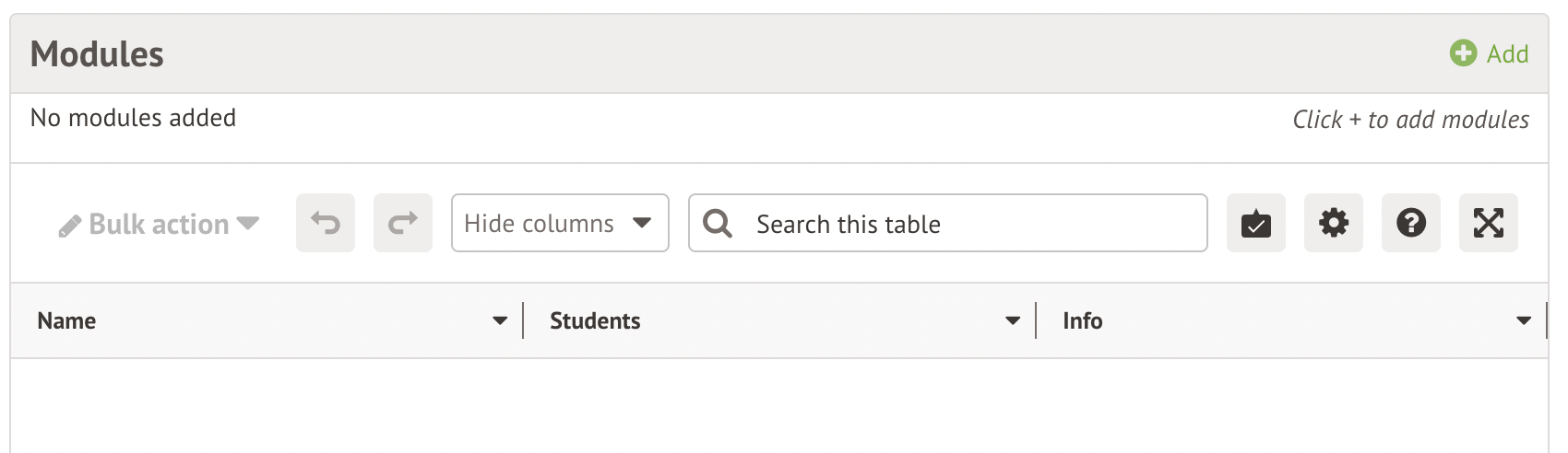 You will be taken to the module overview. You will then need to add a sub-module within this module by again clicking +Add in the Modules section.