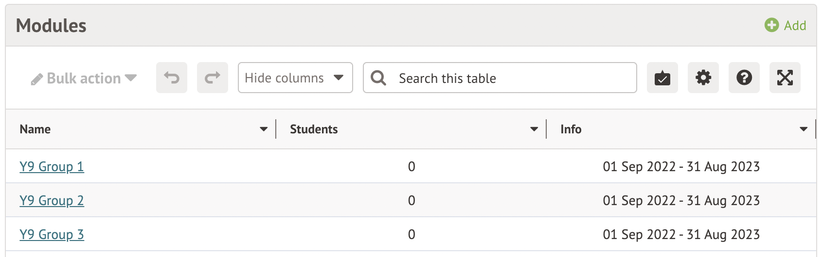 Click into each module to add the students that will be in this group (these will be the same students throughout the whole year).