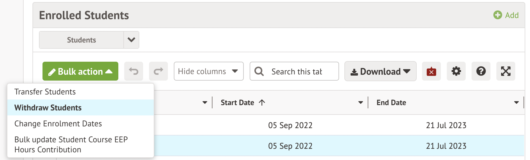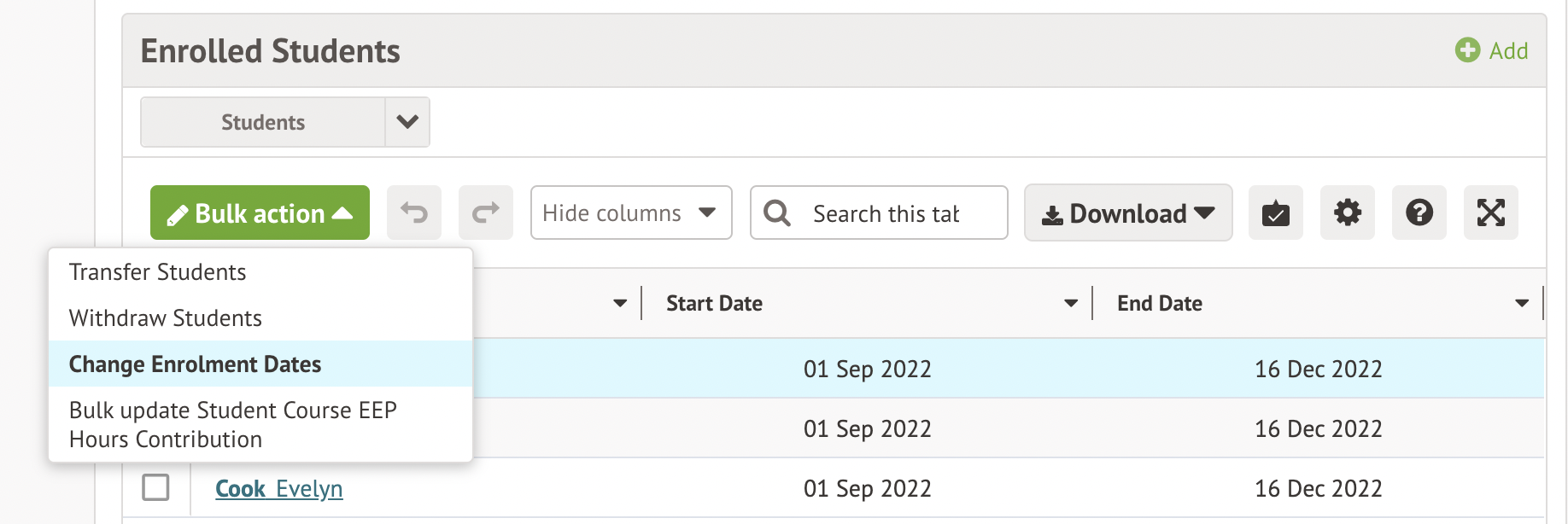 To fix this, you'll first need to amend the current enrolment dates. Select all the students, then click the Bulk action button icon and select Change Enrolment Dates.