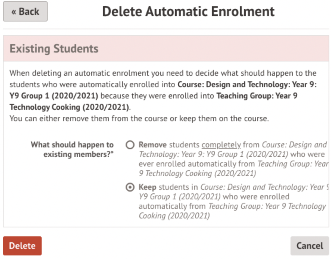 If you picked option 2, you won't be able to edit the student enrolment into the course as this is through automatic enrolment, so you'll need to make changes to the teaching group. Go to Students > Enrolment > Academic > Teaching Groups and click into the teaching group.