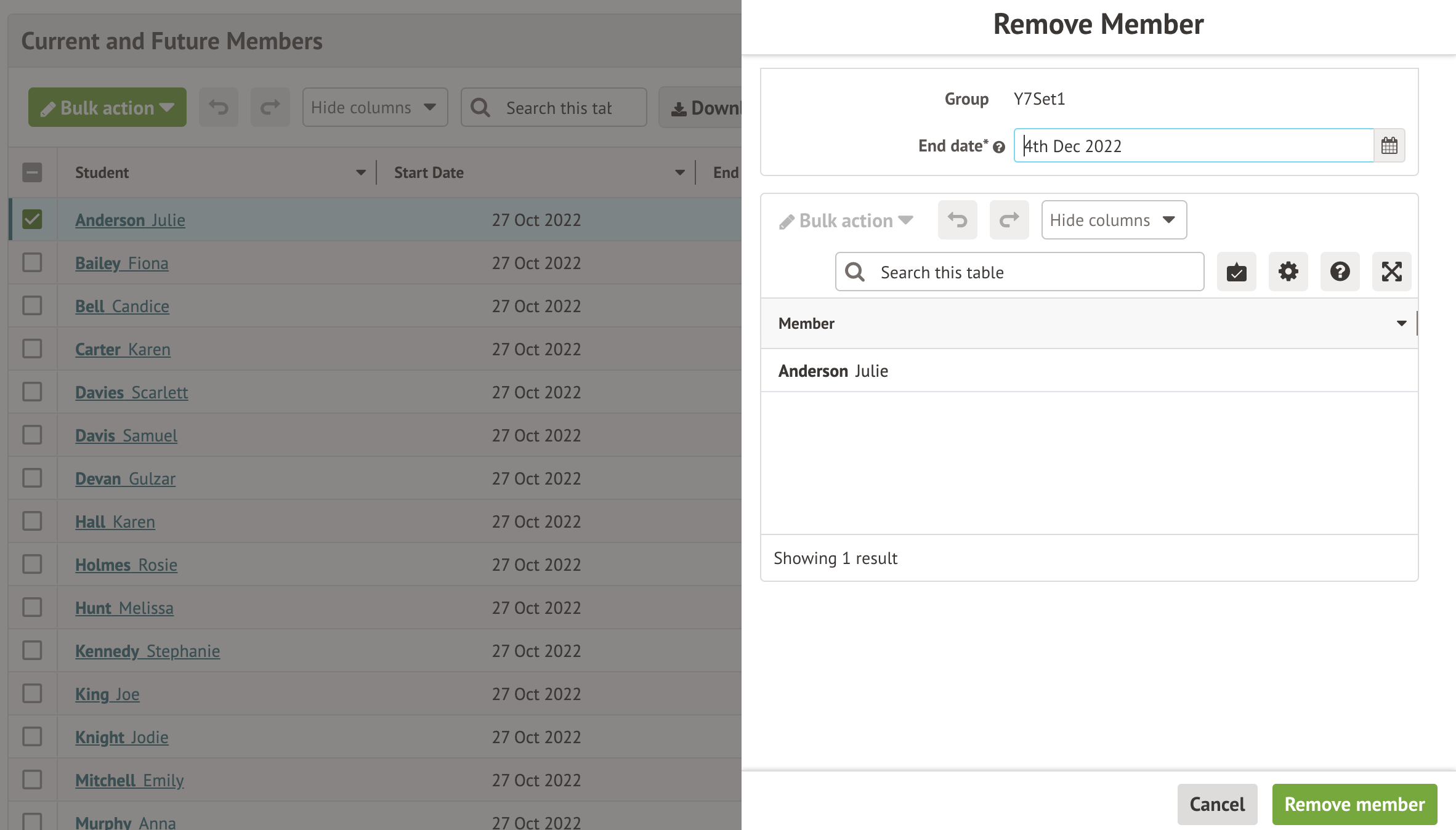 Select the students you want to remove then click the Bulk action button icon to select Remove members.