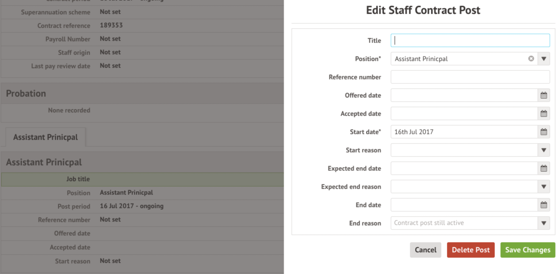 Navigate to the Contract section of the specific Staff member's profile and click the row in their contract containing their Job Title or Position to update the slide over.