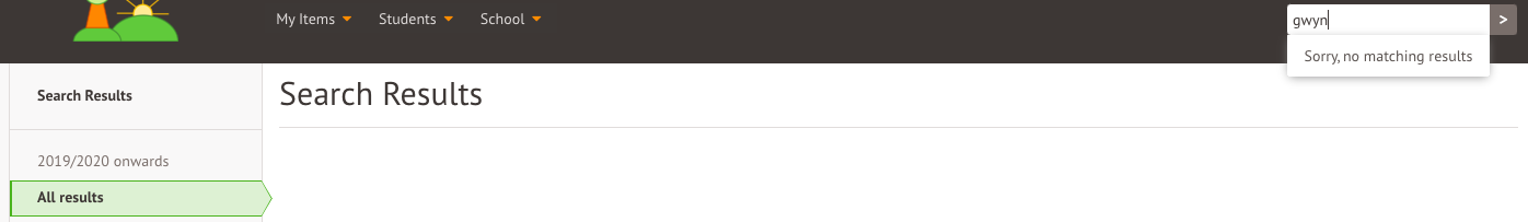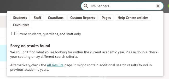 Search for the student in the search box to access their student profile. If you can't find the student, try clicking 'View All Results', 'All Results', or pressing Enter on your keyboard to search for students without enrollments and those enrolled in future and past years. Find more on how to use the search feature here: Using the Global search
