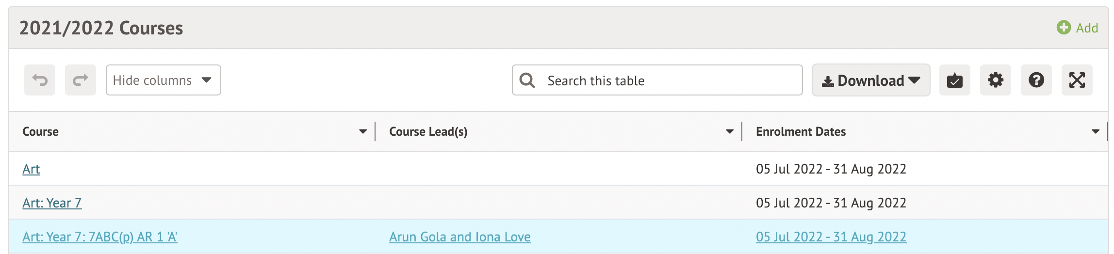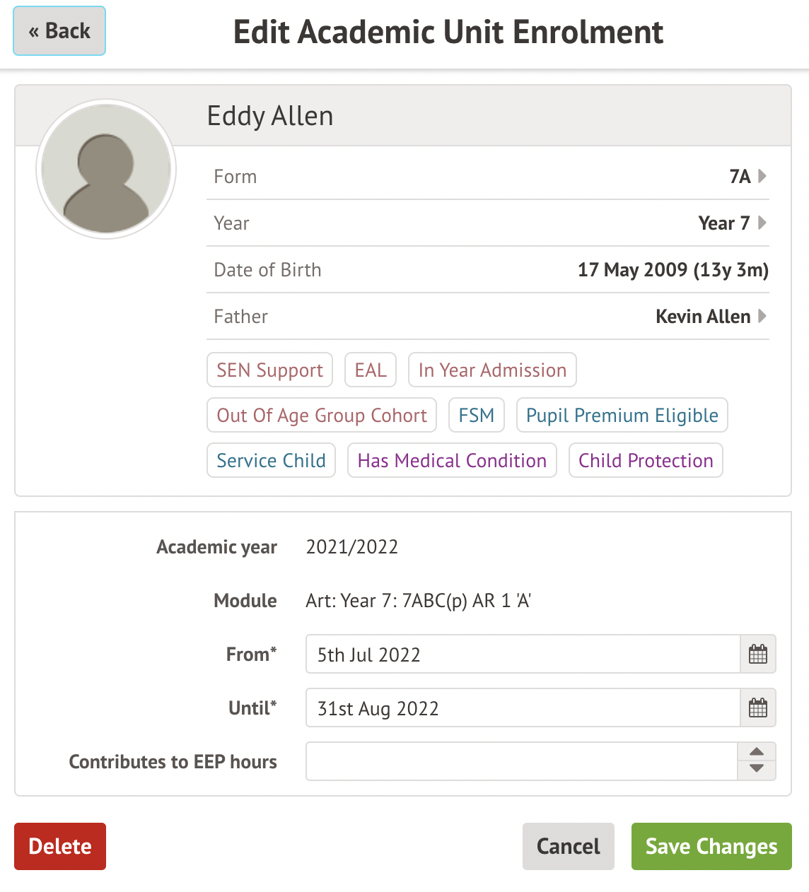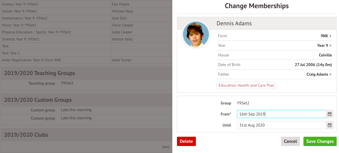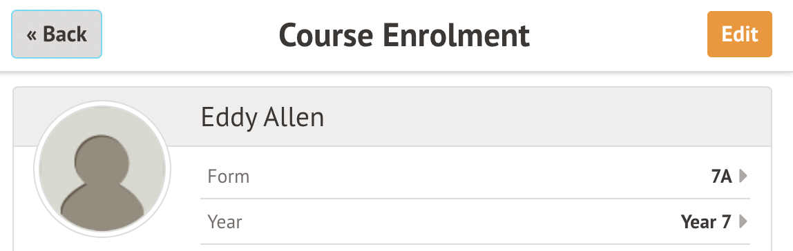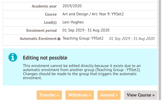 For some enrollments, these will have been processed automatically from a teaching group, registration form group, year group, or custom group, and you won't be able to edit them from the group instead. If this is the case, the slide over after clicking the course informs you that Editing is not possible and which group the automatic enrolment is from.