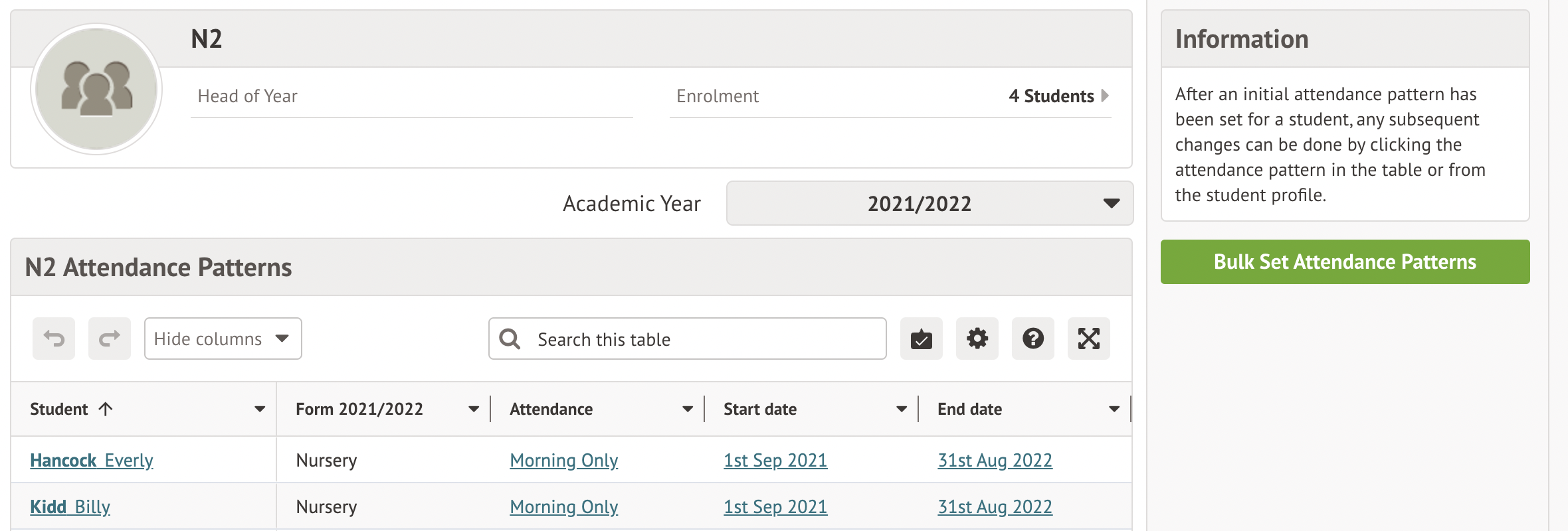 • You may need to give them an attendance pattern from Enrolment > Year Groups > Nursery > Attendance Patterns