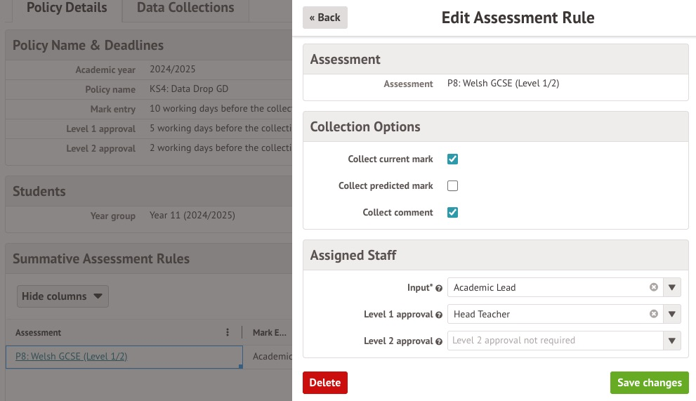 Once you have defined your policy, you'll need to decide how many data drops you'll have during the year, and how long teachers will have to input the marks. You need to set up data collections for each data drop.