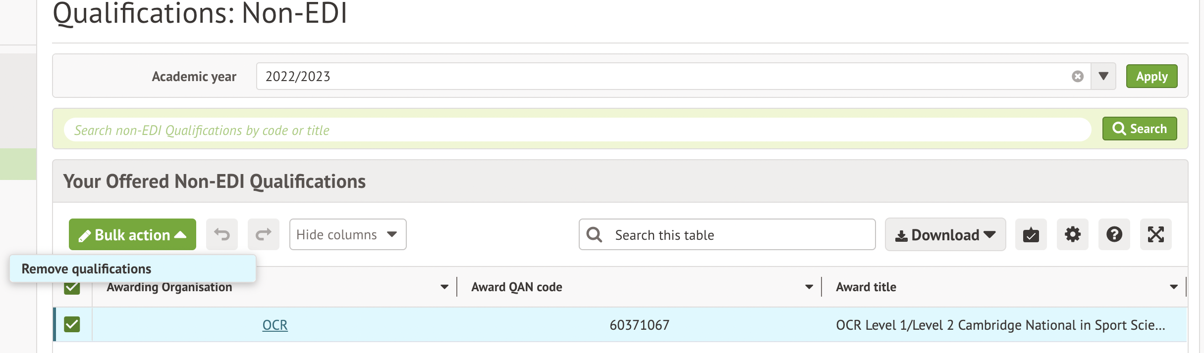 Tick the boxes next to the qualification, then click the Bulk action button to select Remove Qualifications. In the slide over, click on the red Remove Qualifications button.
