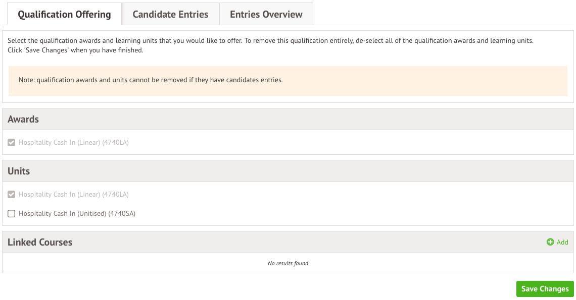 Please note: It is not possible to remove a qualification from the qualification offering if they have had any entries made for the current academic year (including entries marked as Withdrawn).