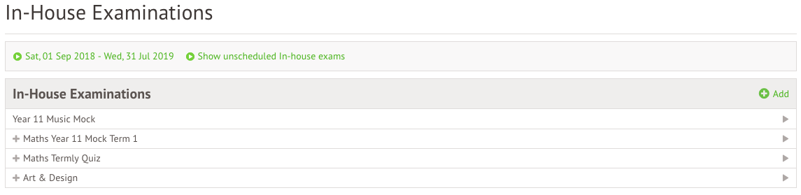 To see your In-house exams, go to Students > In-house Exams > Examinations. This page is useful for checking you have set up your In-house exams correctly before trying to enter results for them.