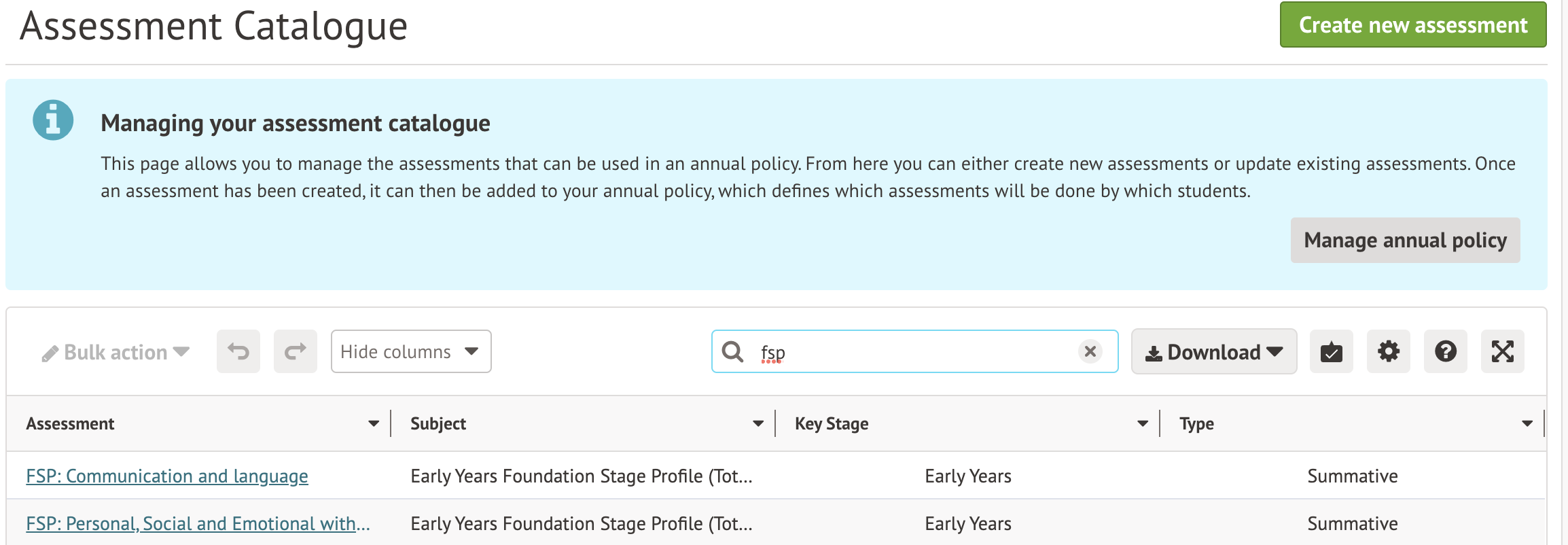 You'll then need to add your assessments to your Assessment Policy from Students > Assessment > Annual Policy > Manage Assessments. Click to add assessments to your policy.