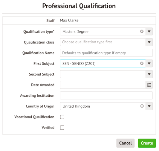 Select the qualification by typing Z201 in the First Subject box to select it. Then click Create to add the qualification to their profile.