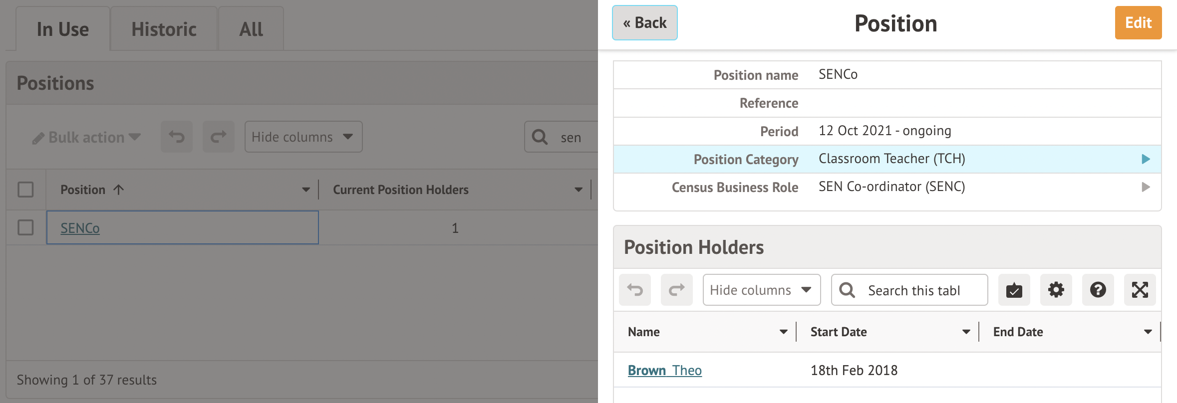 Add the SENCo position in School > All Staff > HR Admin > Positions: Setting Positions, Position Categories and Census Business Roles for the Workforce Census