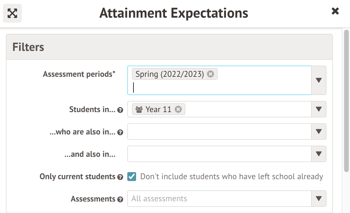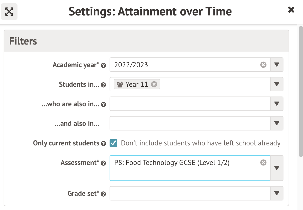 Use the filters at the top of the page to select the student groups to compare or choose which attainment expectations to show. Choose your Date, student group, Grade set, Level type and which assessments to analyse. The Students in field and Grade Set will usually populate with the correct values once you select the assessment, or you can change this to show the display grade set instead.