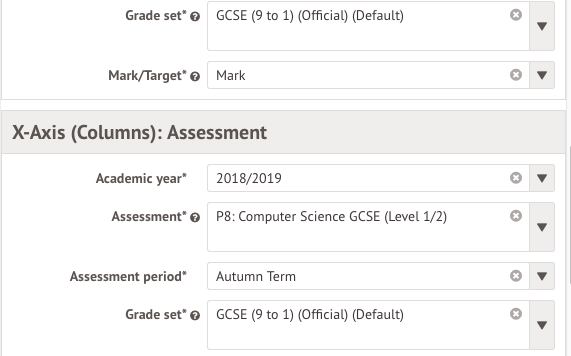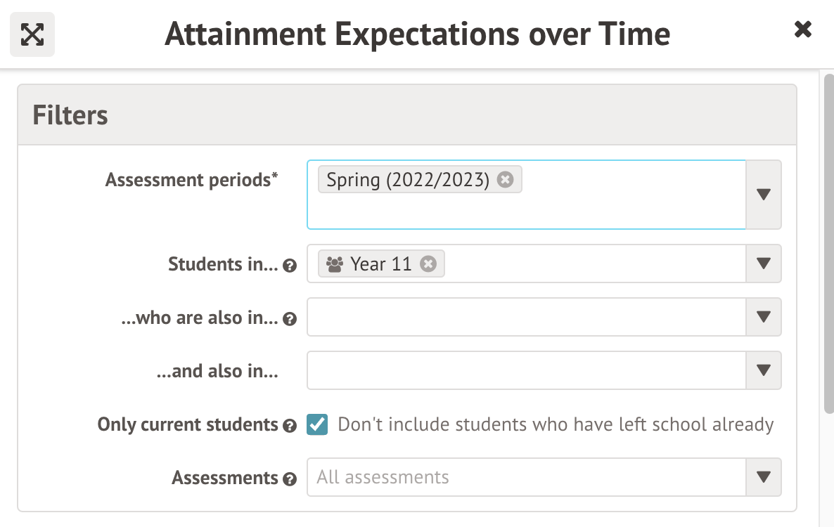 Select one or multiple assessments in the filters. You can also choose in the filters to display data by Year Group and demographics (such as Pupil Premium) or individual student.