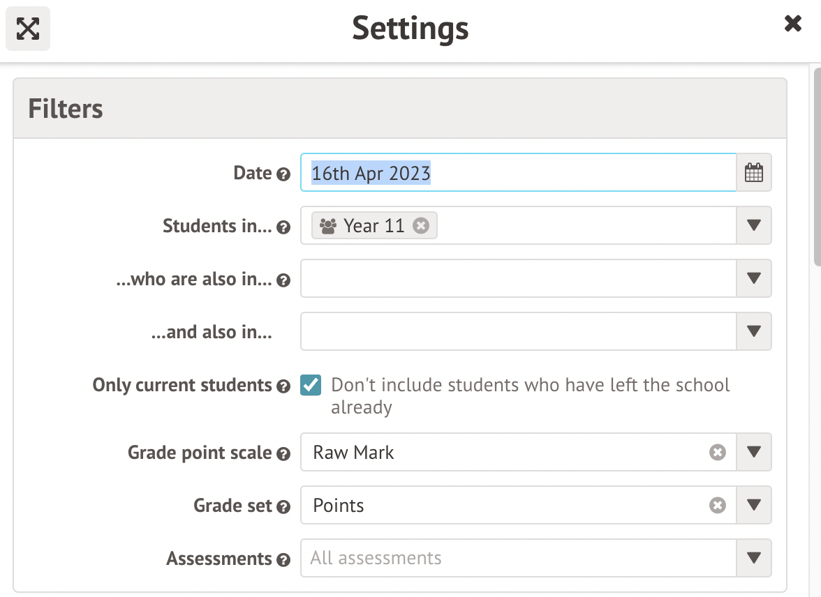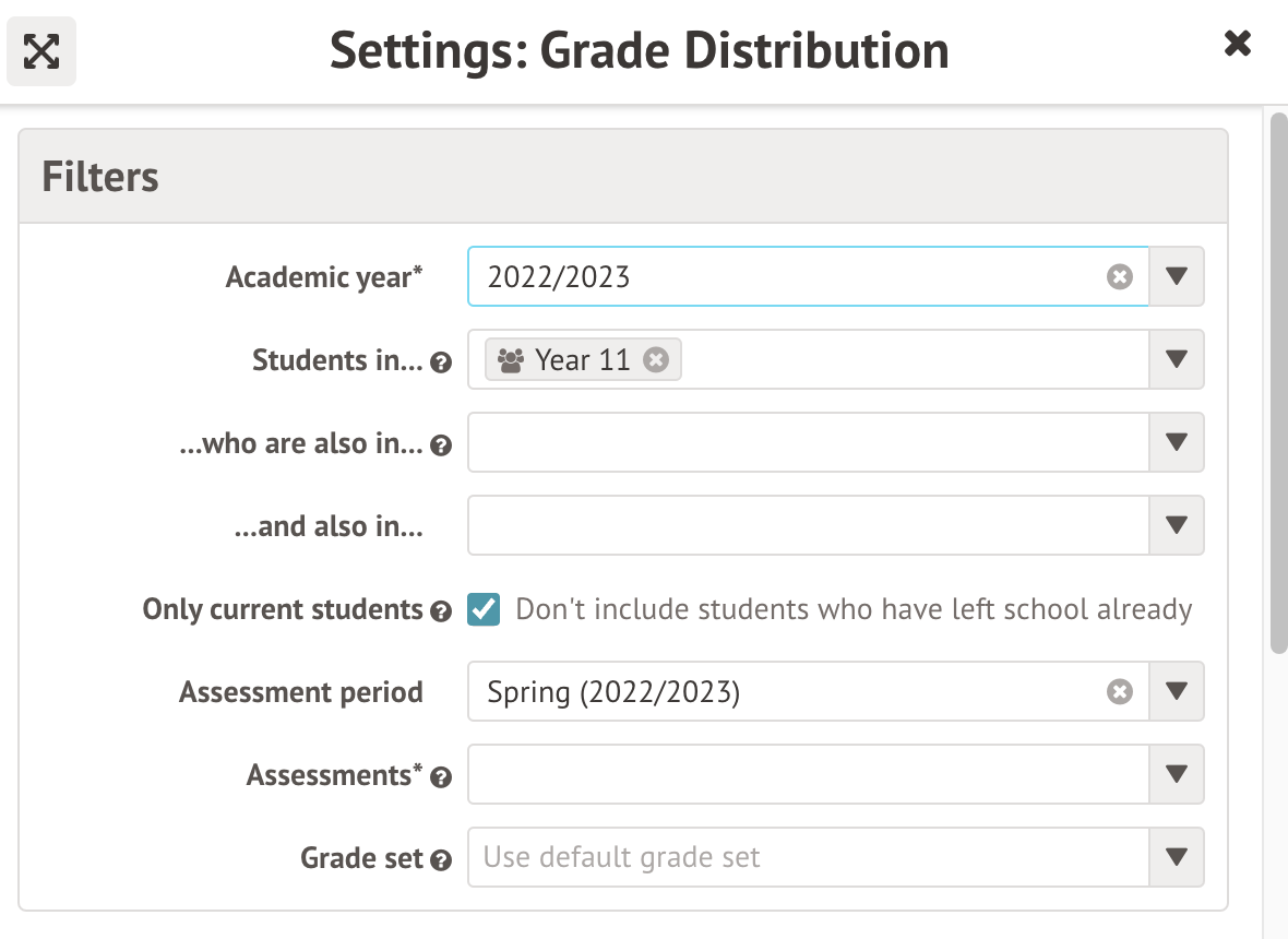 In the filters, you can select the student group, assessment and which grade set to use. The Students in field and Grade Set will usually populate with the correct values once you select the assessment, or you can change this to show the display grade set instead.