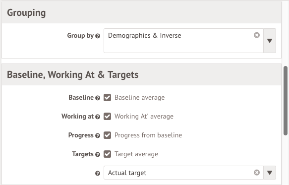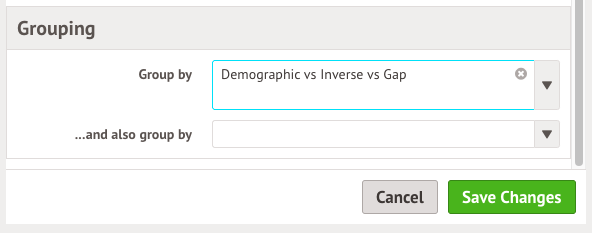 See the GAP between your key demographics and their inverse, then take action to decrease this gap. Just click into the filters at the top of the page, and select Demographic vs Inverse vs Gap in the Group By field, then click Save Changes.