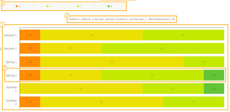 This chart title will always display which assessment periods have been included in a chart. This is especially useful if you want to see the grade distribution by strand and need a reminder of which assessment period you are viewing.