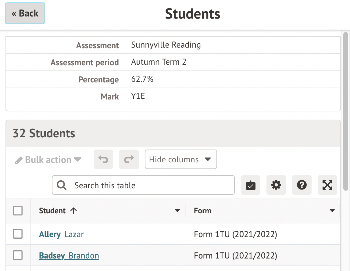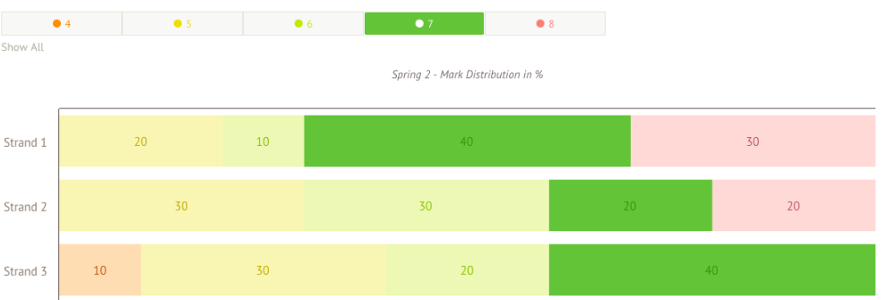First displaying a summary for each assessment period, you can then dig down into each strand of an assessment (for a summative assessment with strands). You can then perform actions for groups of students you have identified, such as emailing or adding to an intervention etc. This is a really useful page for comparisons across classes and across different assessments for the same assessment period.