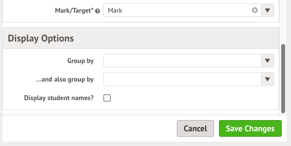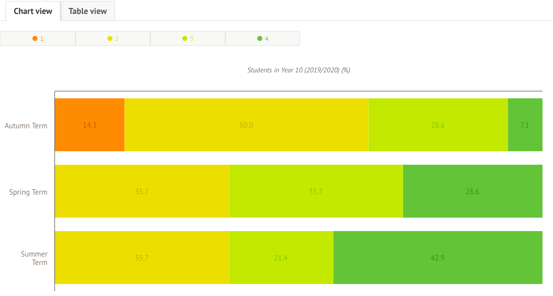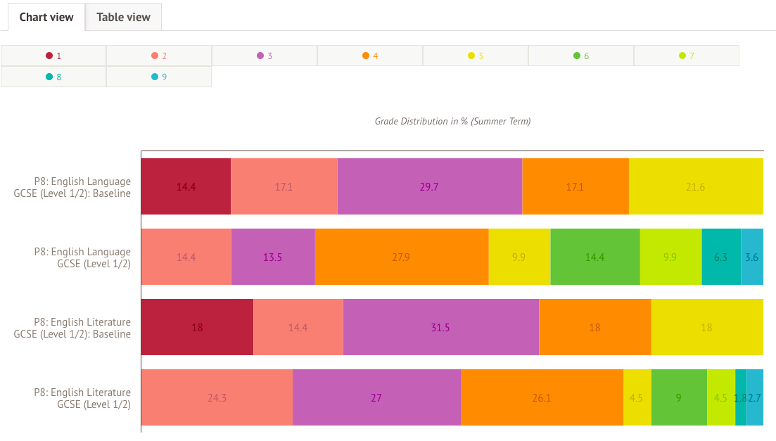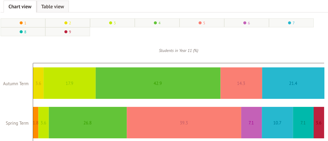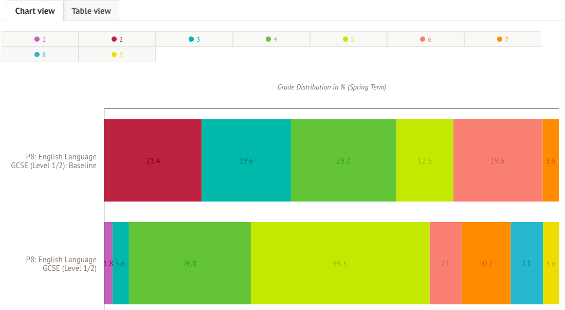 You can choose to group students by demographic, in order to compare grades. For example, comparing girls to boys and identifying that boys require more support in this subject. This means the table will display a breakdown of what grades have been achieved for each group of students over time.