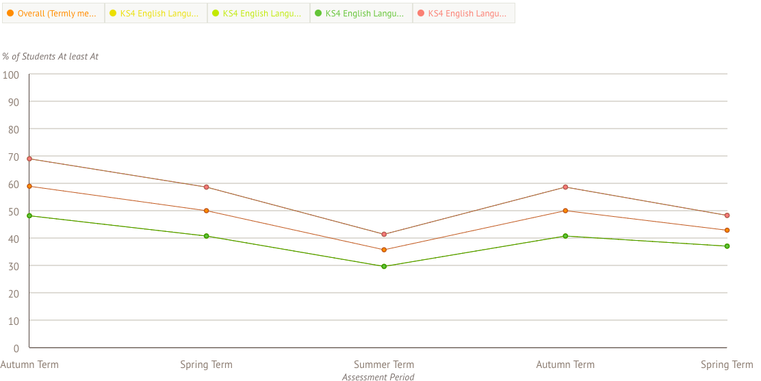 Attainment over Time allows you to see the percentage of students currently working at a specific grade for one assessment. You can view the distribution for each assessment period (e.g. termly) and compare the spread of grades for different year groups.