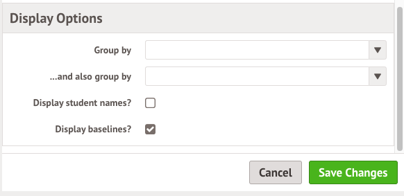 Choose whether to display total numbers and percentages or student names. Click the filters at the top of the page, and tick or untick the Display student names box. You can also select to display baselines using the filters.