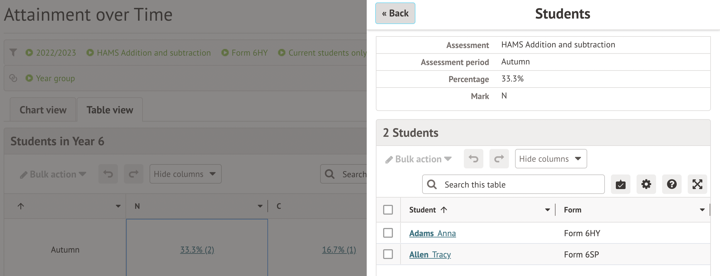 If you click each group you can see which students make up this part of the distribution. In this example, you can compare Autumn grades to Spring grades and you can see Beth has slipped backwards to a grade 1.