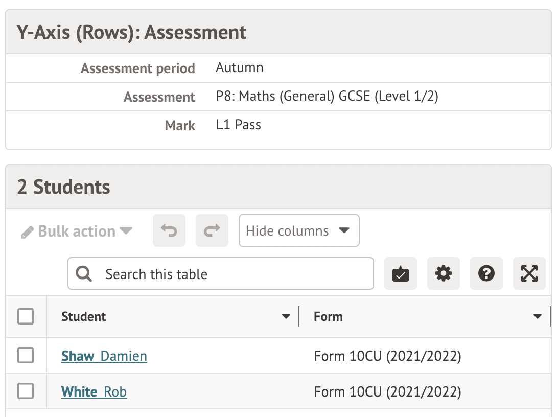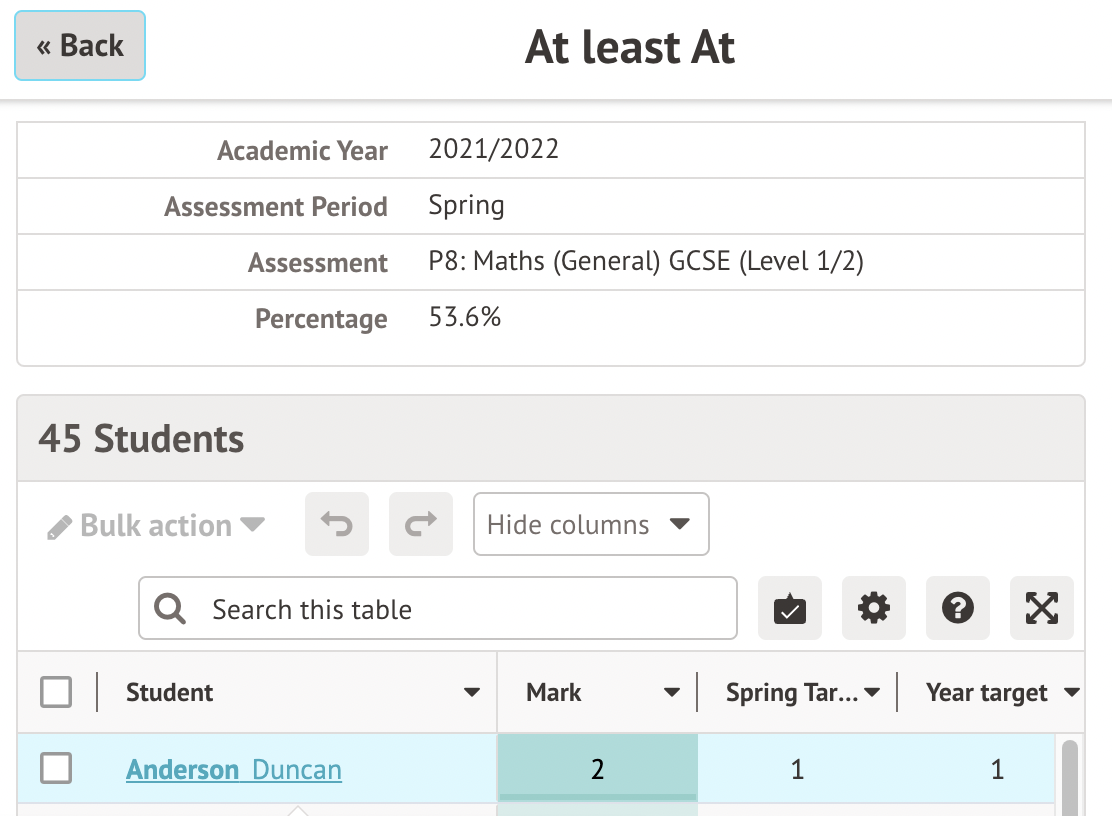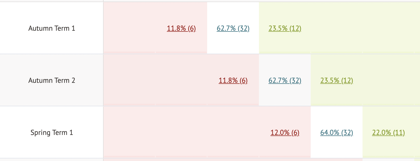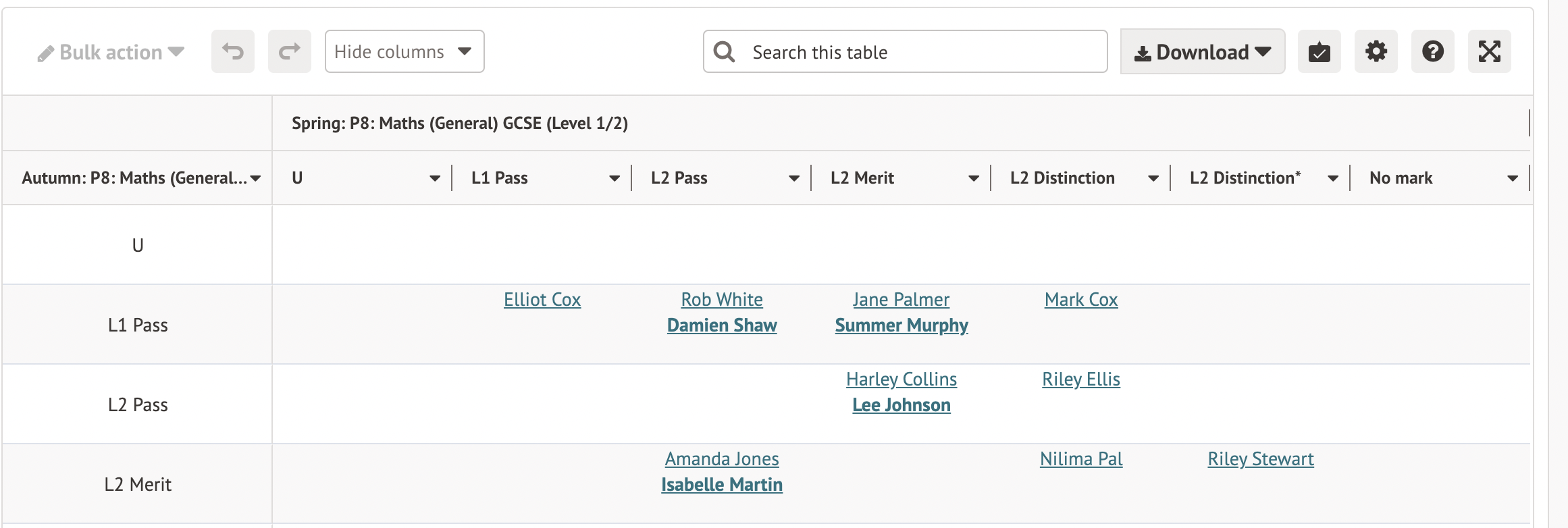 For example, you could use this page to check students are progressing through the grades. Here you can see some students achieved a lower grade in Spring than Autumn.