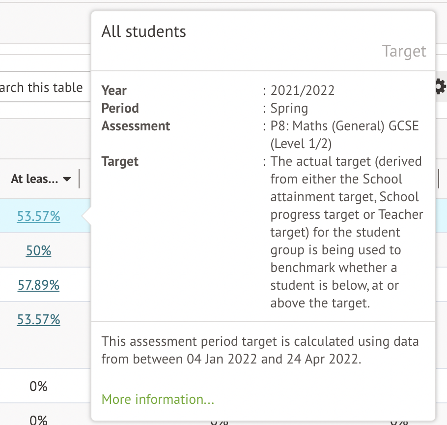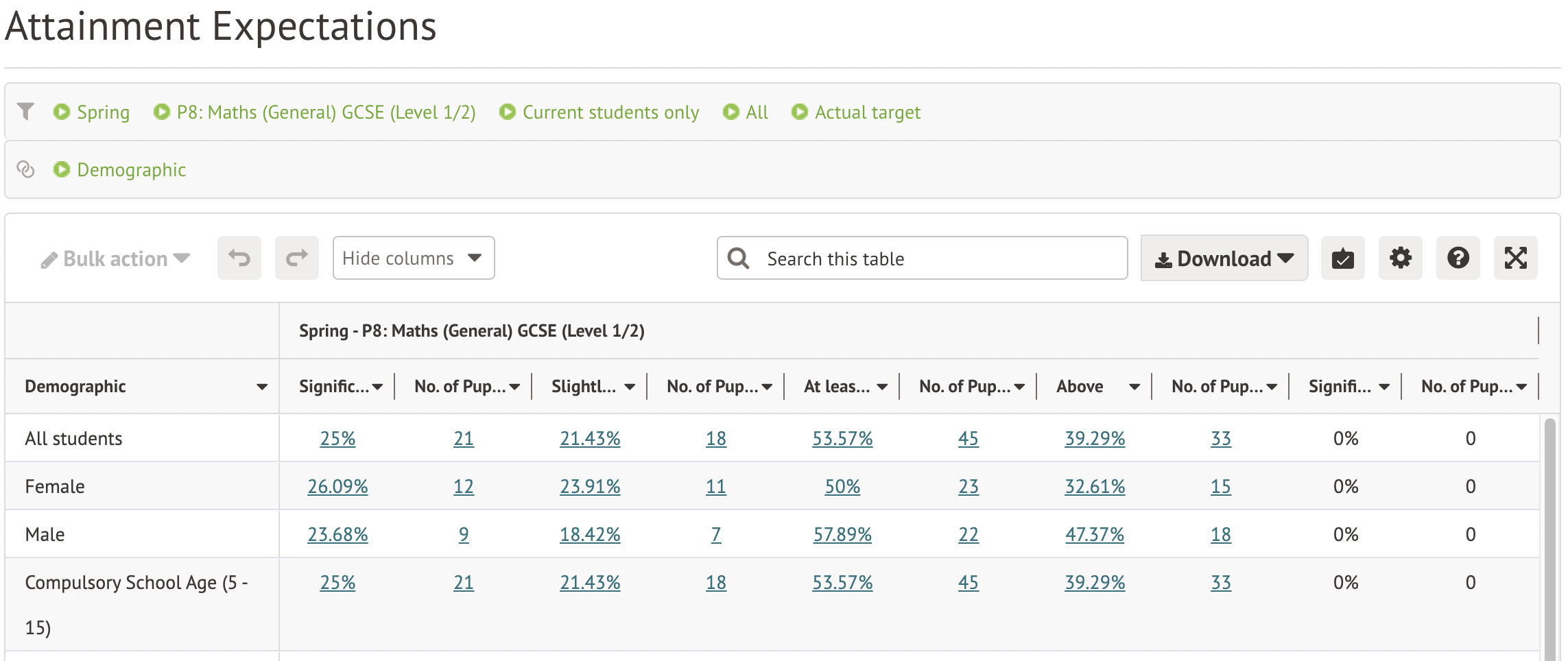 - Any fields showing 0% means no students in that demographic group are working at that Attainment Expectation.