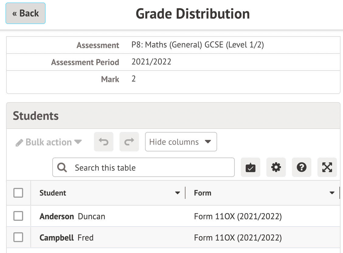 The grade distribution tool in Students > Assessments > Summative Tracking > Analysis > Grade Distribution lets you view the spread of student grades for Summative, Ad Hoc and Standardised Assessments.