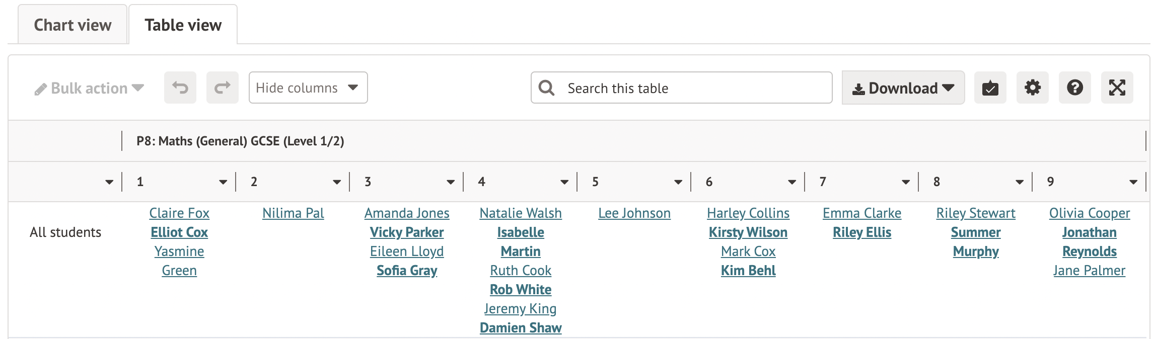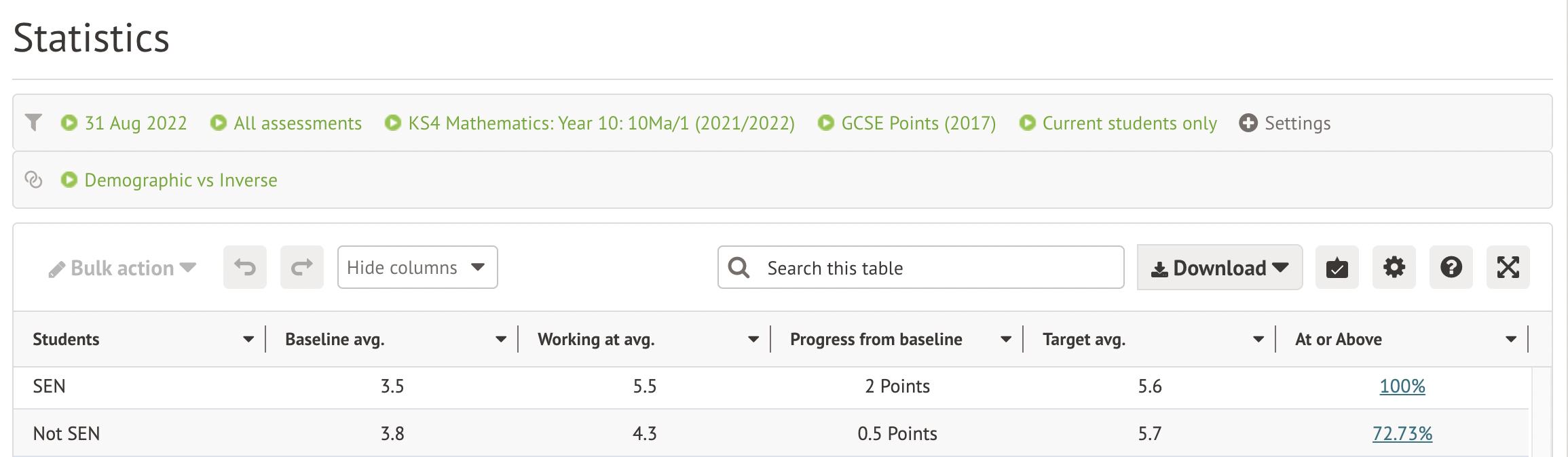 A range of comparative groups can be displayed to show attainment and progress on one chart. As with all tables, you can click the headers to sort students by most or least progress.