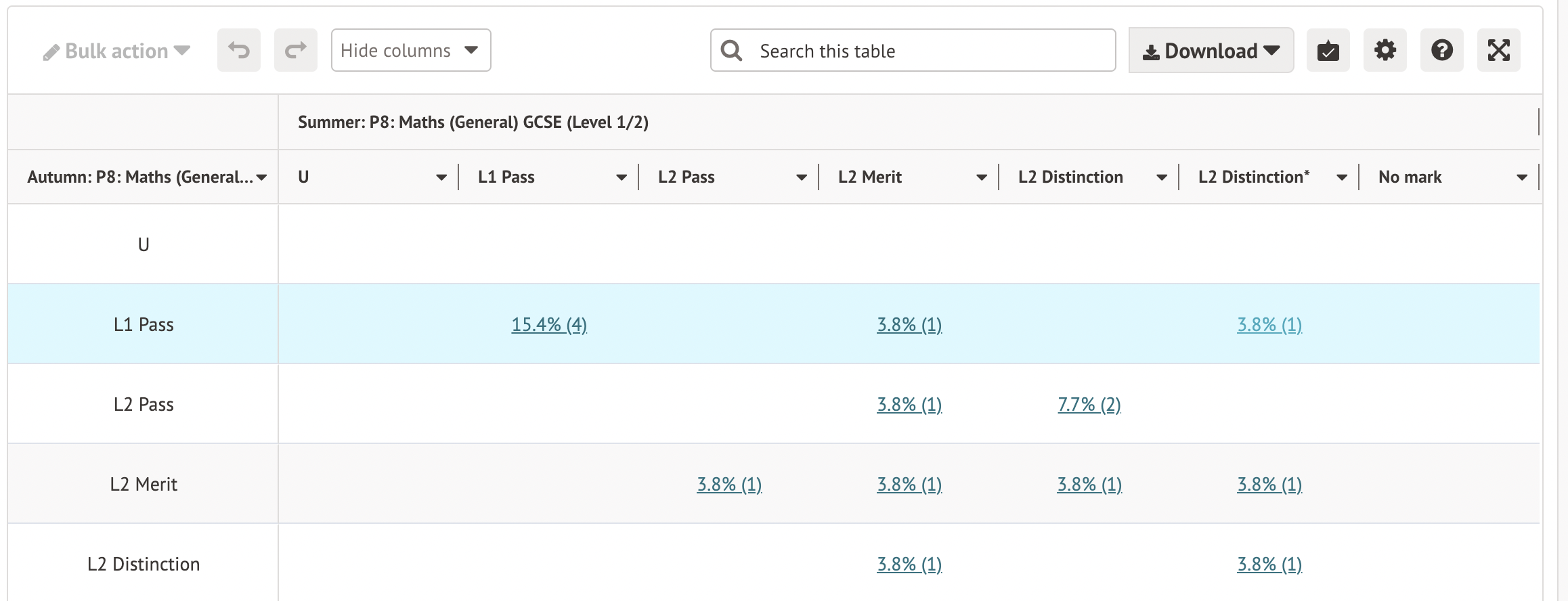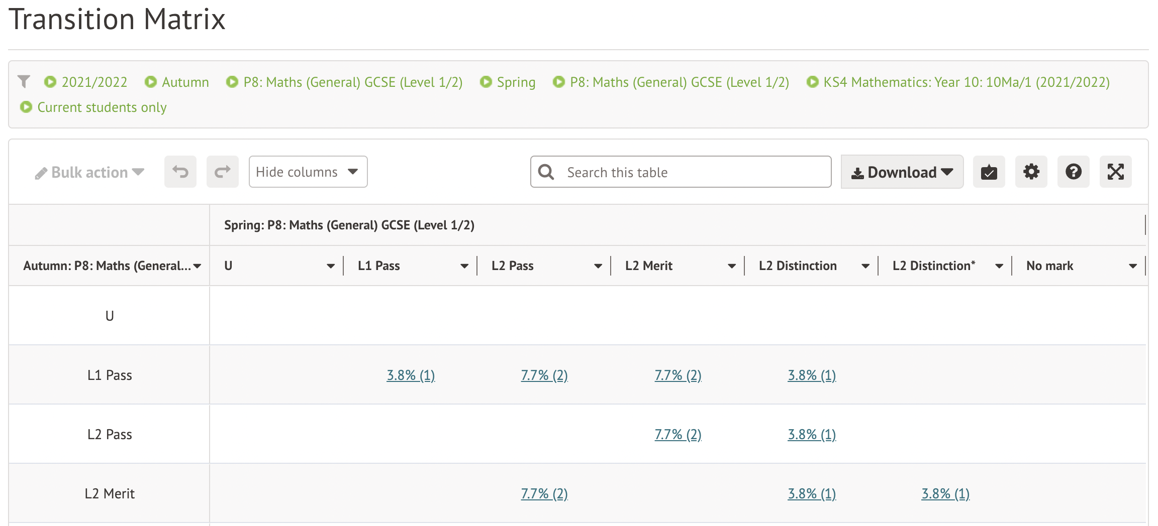 You can use the Transition Matrix to compare what students are currently achieving with their KS2 SATs result to see if they have they made the amount of progress you expected. You can then see the percentage and number of students with each mark combination.