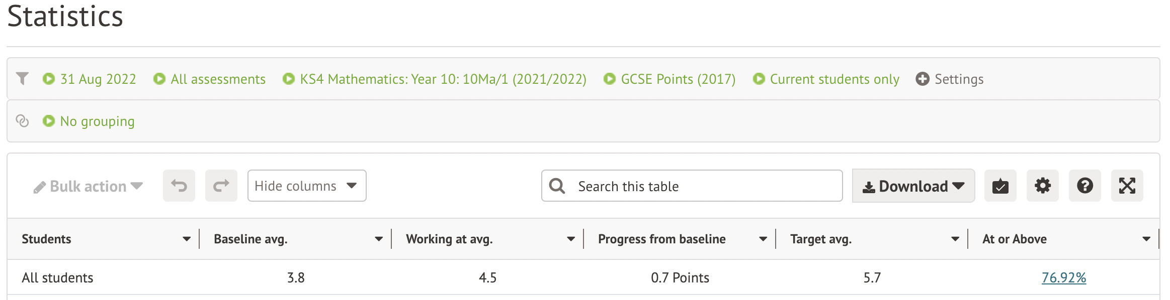 The Statistics page shows a table of students' average grades including average baseline, average working at grade and average target. It can also be used to find the distance between their grade and their targets, and the percentage of students working below, at or above their targets.