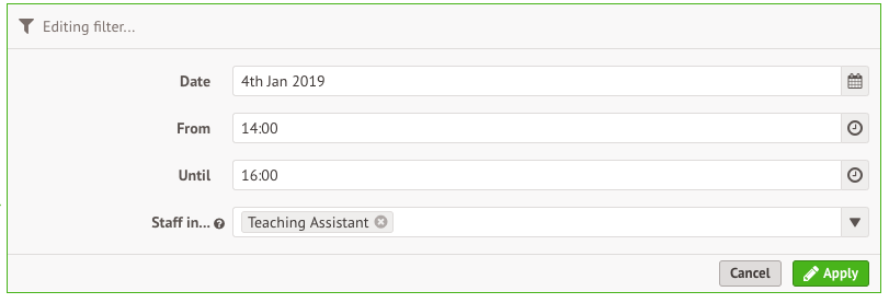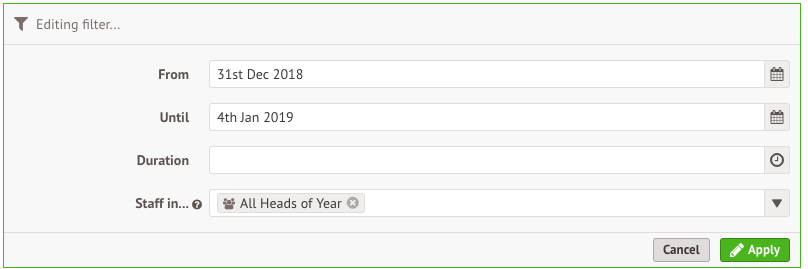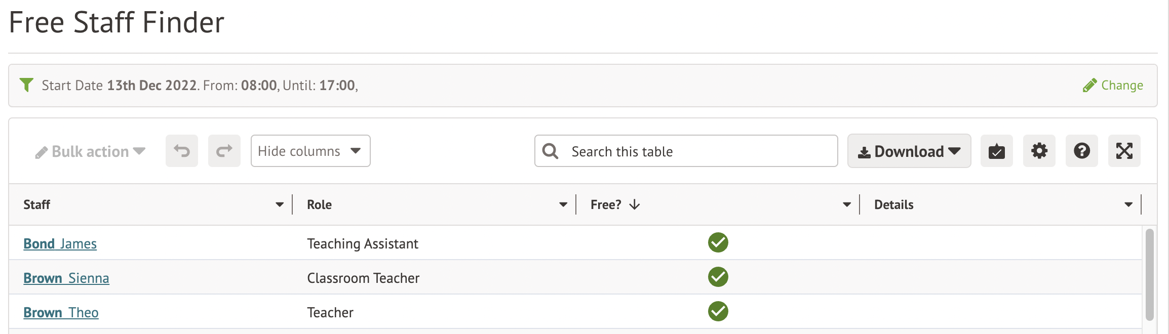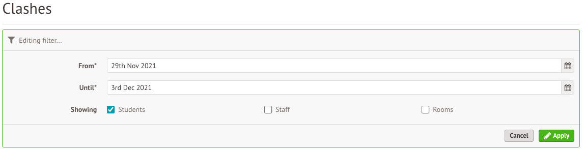 You can use the filters at the top of the page to choose the effective dates to view, and whether to filter down to look at Students, Staff or Rooms (or a combination).