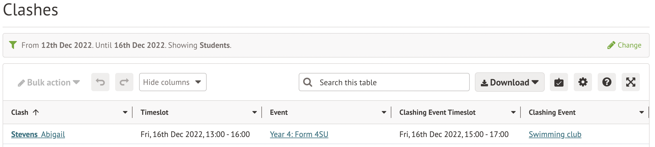Jump right into resolving the clash by clicking the event. You can also suspend classes, or remove students from one lesson in the class using Student Timetable Slot Exceptions.