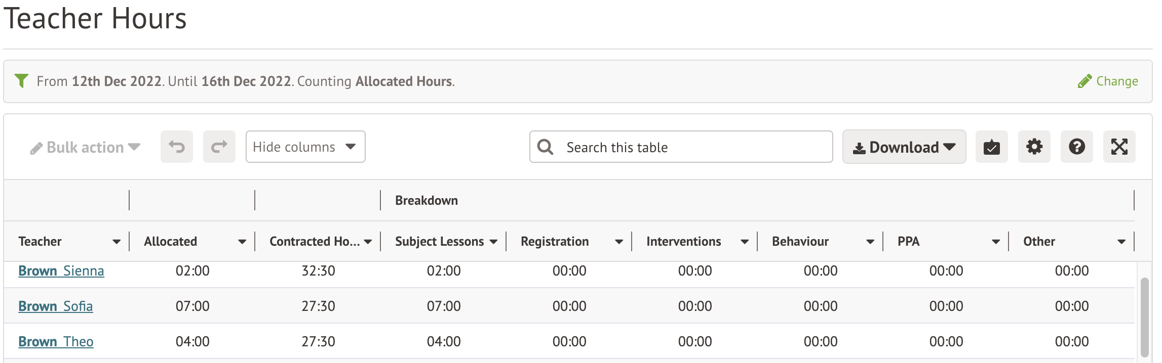 Here you can identify how many timetable periods teachers are allocated to teach for registration sessions, lessons, interventions, behaviour (such as detentions), PPA and other.