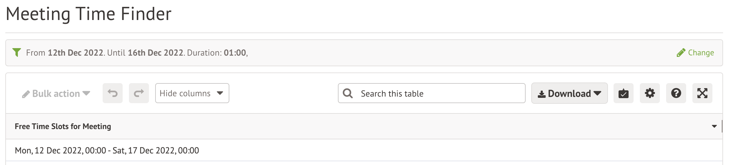 Just input the dates the meeting can take place within, how long the meeting will be, and what staff members need to attend into the filters at the top of the page to utilise this feature.